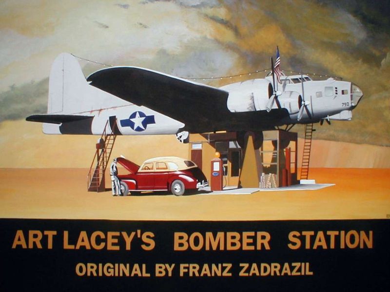 Dieses Bild habe ich 2000 mit dem Hintergrund und Teilen des Flugzeuges begonnen. Dann habe ich es für in etwa ein Jahr beiseite gelegt, um es erst im Jahr 2001 fertigzustellen. Wie die Bildunterschrift zeigt, ist das Original „Art Lacey‘s Bomber Station“ von Franz Zadrazil gemalt worden. Ich habe dieses Bild im Katalog „PGM Art World 1998 entdeckt und war so begeistert, dass ich es selber malen wollte.