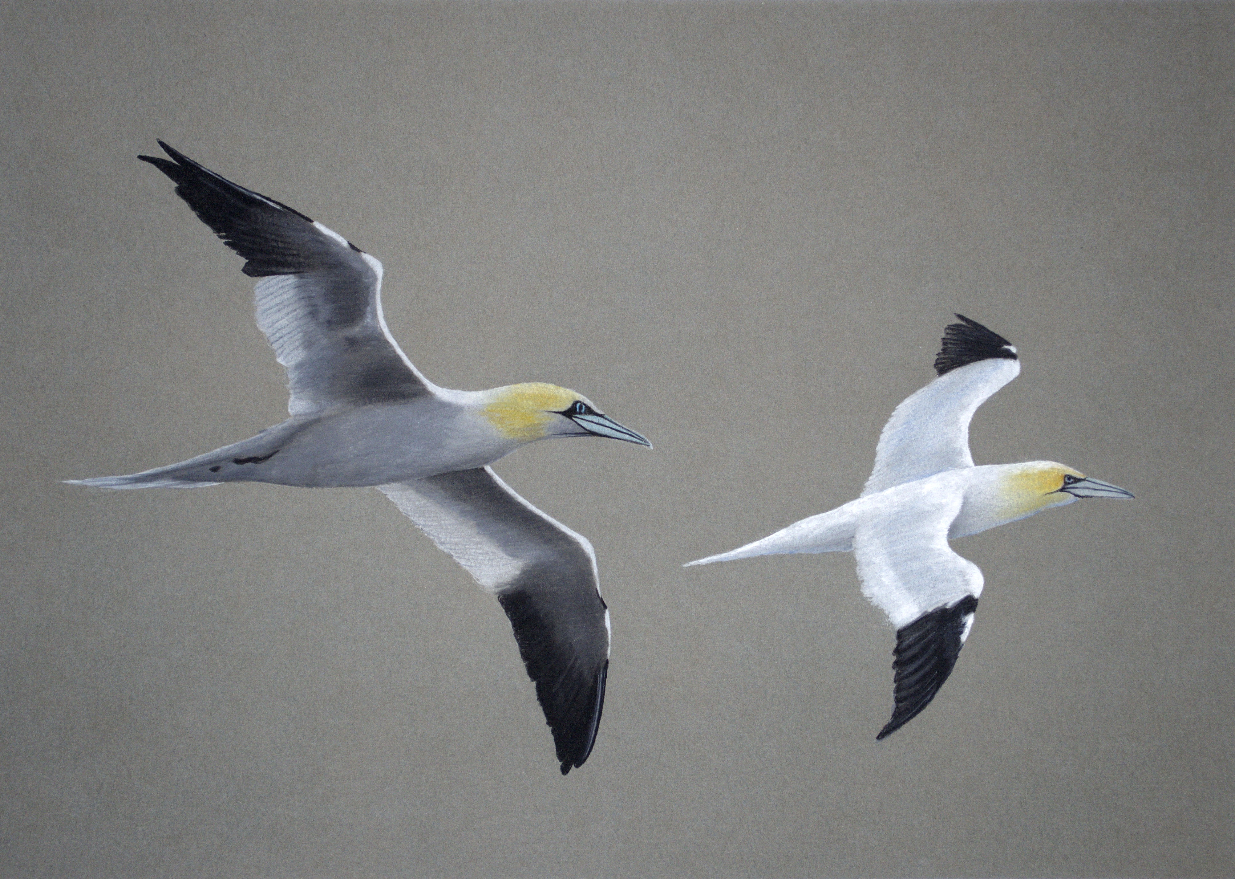 Im Sommer 2019 habe ich eine kleine Serie von Zeichnungen auf Tonpapier von Küstenvögeln begonnen. Insbesondere der elegante Basstölpel hat es mir angetan.