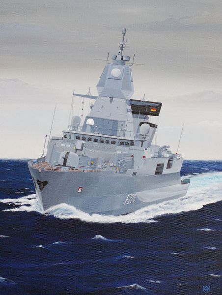 Dieses Bild zeigt die Fregatte "Hamburg" (F-220) der Sachsen-Klasse. Bei diesen Schiffen handelt es sich um Mehrzweckschiffe, die für den Geleitschutz und für die Gebietssicherung vorgesehen sind. Nähere Informationen zu diesen Schiffen gibt es auf der Internetpräsenz der Bundesmarine.