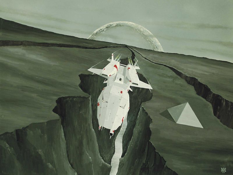 In den 80er Jahren habe ich zufällig den mehrteiligen Comic (?) “Krane - der Krieger” in den Heften 46 bis 51 von SCHWER METALL entdeckt. Es handelte sich bei dieser Serie um einen sehr gut gezeichneten Science-Fiction-Comic, dessen Raumschiffe mich zu diesem Bild inspirierten. Ausnahmsweise ist der überwiegende Teil des Bildes in Gouache gemalt, nur der graue Himmel ist in Spraylack gearbeitet.