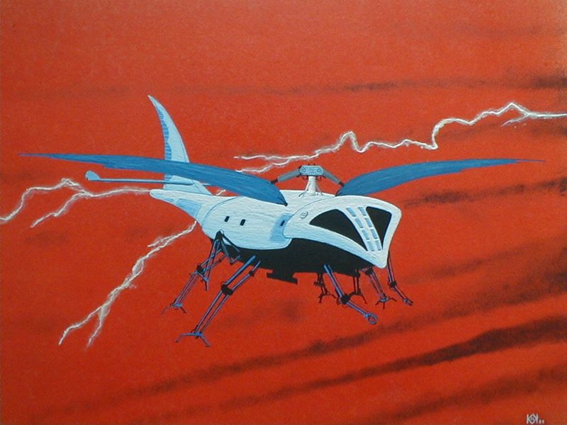 Der erste Versuch mit Spraylackfarben! Inspiriert durch einige Bilder aus Roger Deans Buch "Views" habe ich diese mechanische Libelle gemalt. Dies ist das erste Bild, bei dem der Hintergrund mit Auto-Spraylack erstellt wurde - die wolkigen Strukturen und die Libelle wurden dann mit Gouache erstellt. Diese Technik sollte von 1981 bis zum Ende des Jahrtausends meine bevorzugte Maltechnik werden...