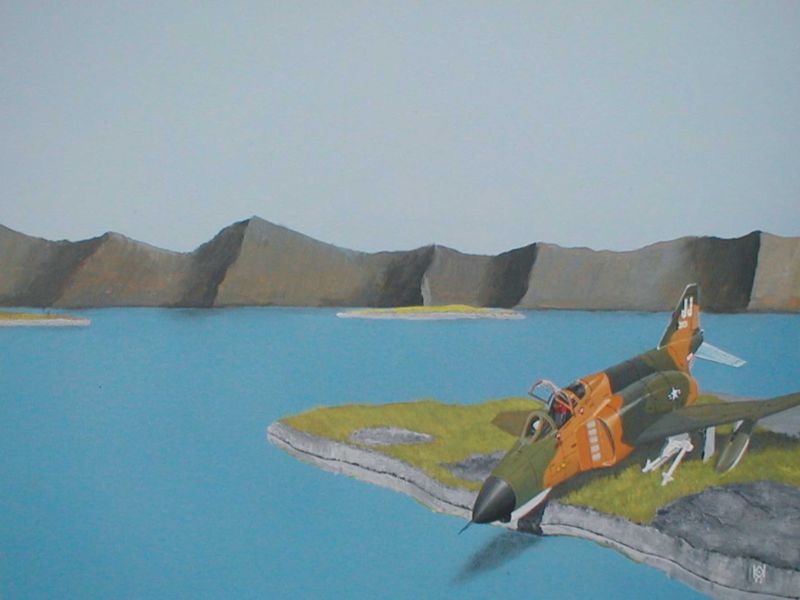 Dieses Bild habe ich 1982 fertiggestellt. Es zeigt eine F4 Phantom, gestrandet im Niemandsland - wer weiss, wie der Pilot diese Landung geschafft hat ....