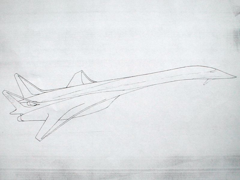 Vor längerer Zeit haben sich die Luftfahrtzeitschriften mit der Entwicklung neuer Überschallflugzeuge beschäftigt. Diese Skizze war für ein Bild gedacht, auf dem dieses Flugzeug über einer Halbinsel in großer Höhe fliegt. Vielleicht male ich dieses Bild irgendwann einmal (möglicherweise auch mit auf dem Computer als digitale Version).