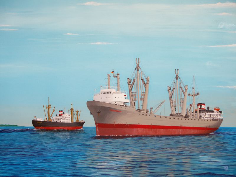 Dies ist das dritte Bild der kleinen Serie zu Schiffen der DDG Hansa. Eszeigt im Vordergrund die "Treuenfels" und im Hintergrund die "Ehrenfels". Die "Treuenfels" wurde 1959 als fünftes Schiff der Schwarzenfels-Klasse gebaut - allerdings war sie mit einem wesentlich leistungsfähigeren Schwergutgeschirr (2 x 130t) ausgestattet. Sie war 145,5 m lang, 19,1 m breit und hatte einen Tiefgang von 9,2 m. Mit ihren 5.850 PS konnte sie eine Geschwindigkeit von 14,5 kn erreichen. Sie wurde 1986 abgebrochen.