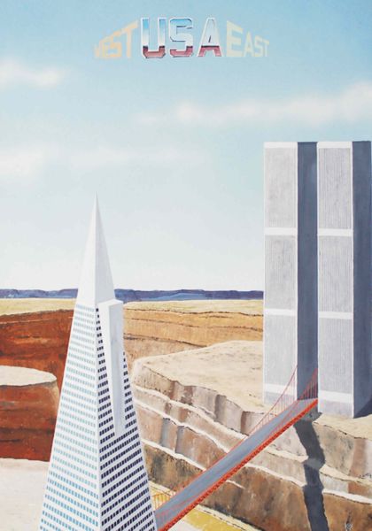 Die Aufgabenstellung war, ein Plakat über eine Landschaft zu erstellen. Der Himmel ist mit Spraylack gearbeitet, der Rest, wie üblich, mit Gouache. Auf diesem Plakat werden einige markante Landschaften und Gebäude in den USA in Bezug zueinander gesetzt. Die Farben in der Überschrift des Plakates beziehen sich auf die Landschaften des Westens (Wüsten) und des Ostens der USA. Die Buchstaben USA sollen in Chrom erscheinen.